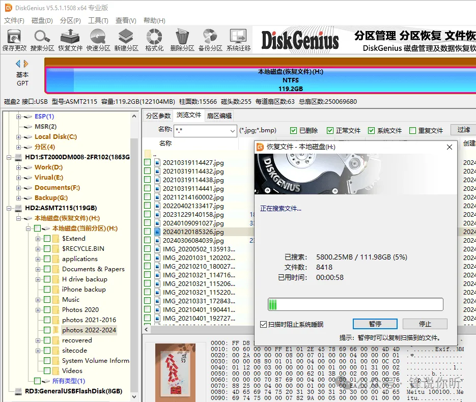 如下图所示,DiskGenius正在搜索丢失的文件,已经列出一些搜索到的文件。默认的设置是同时进行快速扫描和深度扫描。快速扫描可以找到最近删除的文件,深度扫描是进行逐扇区的搜索,以便找到更多文件。如果需要扫描的区域比较大,或是硬盘本身读写速度很慢,那么扫描会需要一些时间,需要耐心等待。