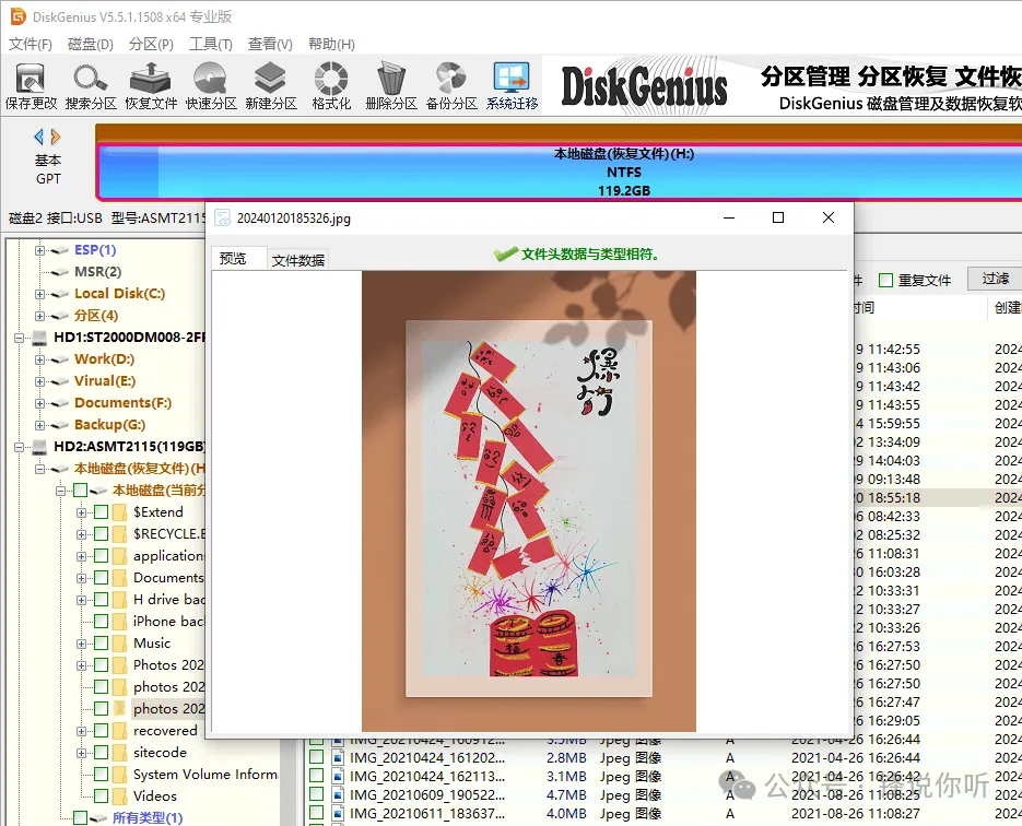 在软件里可以看到丢失的文件,双击某个文件就可以打开预览窗口,如下图所示。如果文件预览可以正常显示文件内容,表明这个文件没有损坏。
