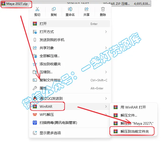 1.选中下载的压缩包,然后鼠标右键选择【解压到当前文件夹】