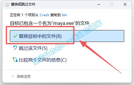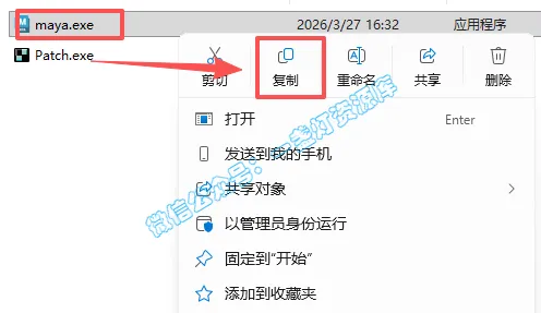 8.返回之前解压的文件夹,双击打开【Crack】文件夹,选中【maya.exe】文件,鼠标右键点击【复制】