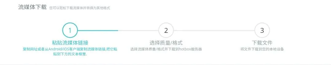 | 2 | 选择画质/格式 | 根据需求挑选合适的视频画质,同时选择目标格式,文件会先下载至Hotbox服务器 |
