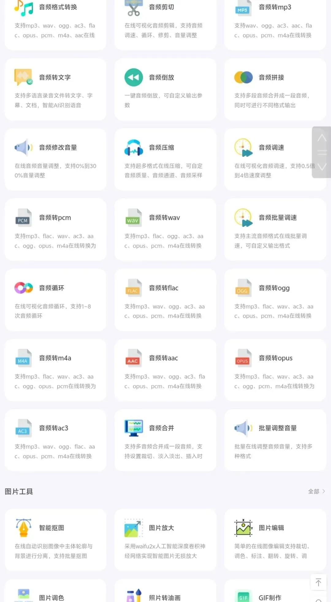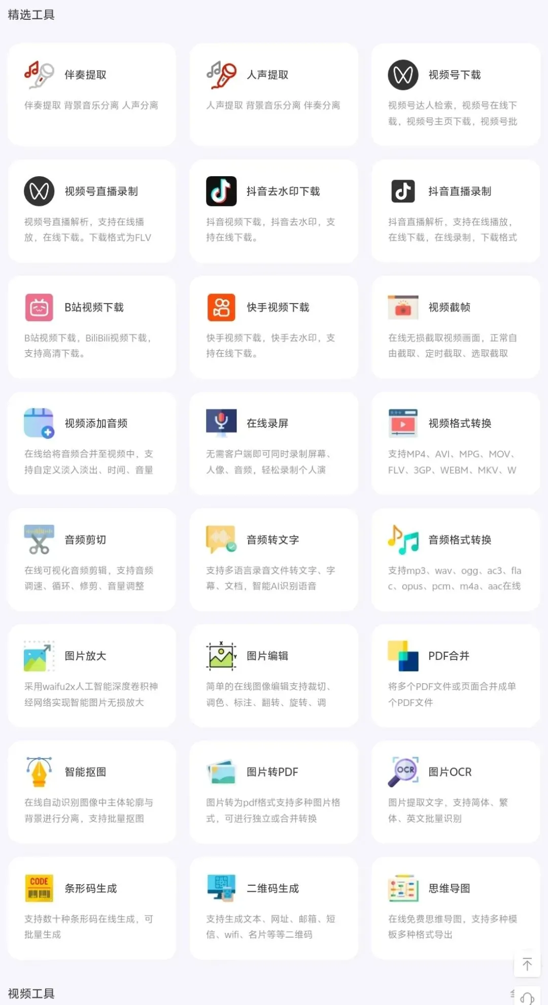 它分类挺全的,视频下载、图片处理、音频提取、文字识别、文档转换、办公辅助、编程开发、在线录屏都有。比如格式转换、文字识别、提取字幕、智能抠图、GIF动图制作、PDF转换编辑这些,不用专门装软件,打开这个网站就能搞定。