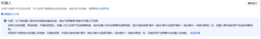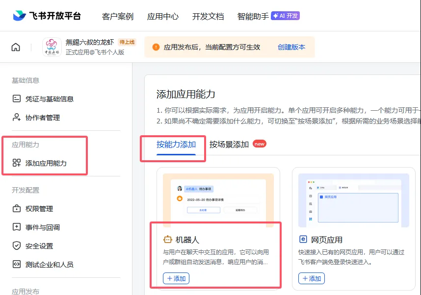 左侧菜单选择“添加应用能力”,然后右侧选择添加“机器人”。