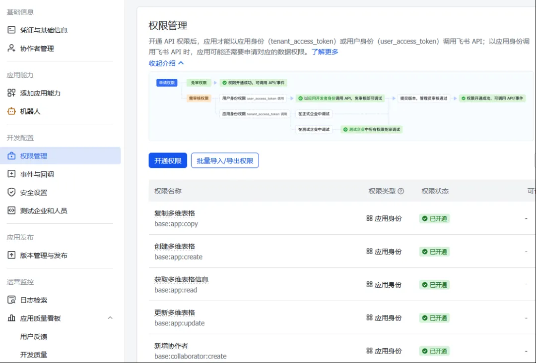 在权限管理中开通权限或批量导入权限。按需开通事件订阅、通讯录、消息与群组、云文档及多维表格等权限。