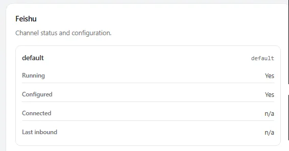 打开openclaw的网页面板,在“控制/频道”(Channels)一栏,可以看到除了之前的“QQ Bot”外,又多了一项“Feishu”,只是Connected和Last inbound均为“n/a”。