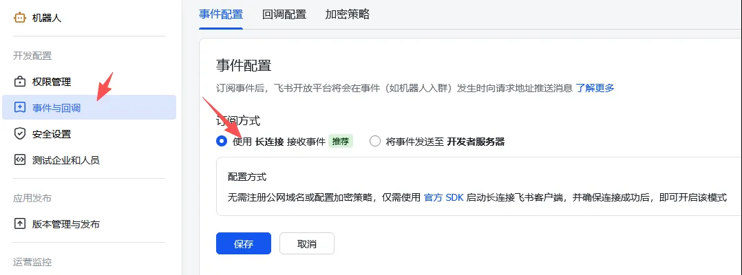 回到飞书开放平台,点击左侧事件与回调,在事件配置的订阅方式中选择使用长连接接收事件。