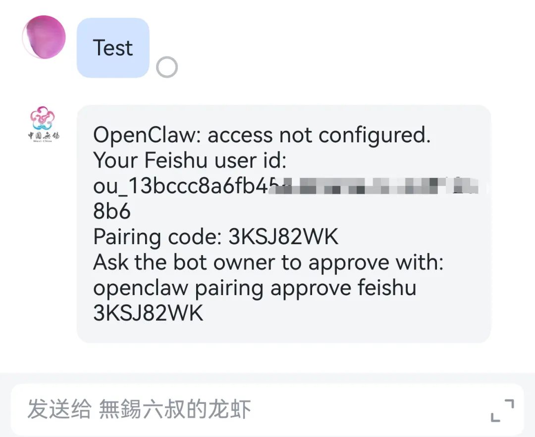 默认情况下,机器人会回复一个配对码。您需要批准此代码(此时已经可以在 WebUI 中直接和机器人对话,让它帮忙完成这步):