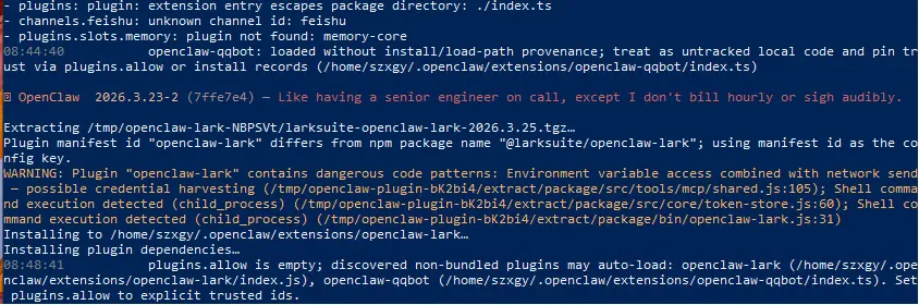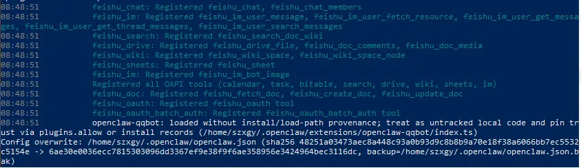 以上是安装过程中的一些日志,从中可以看出openclaw.json中的一些疑似问题,但该插件应该安装完成了。