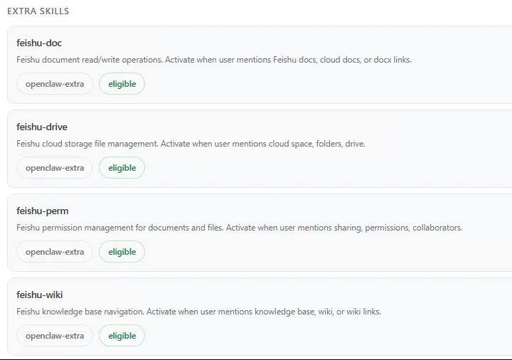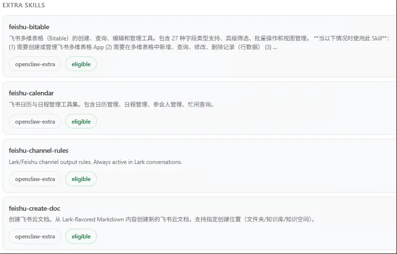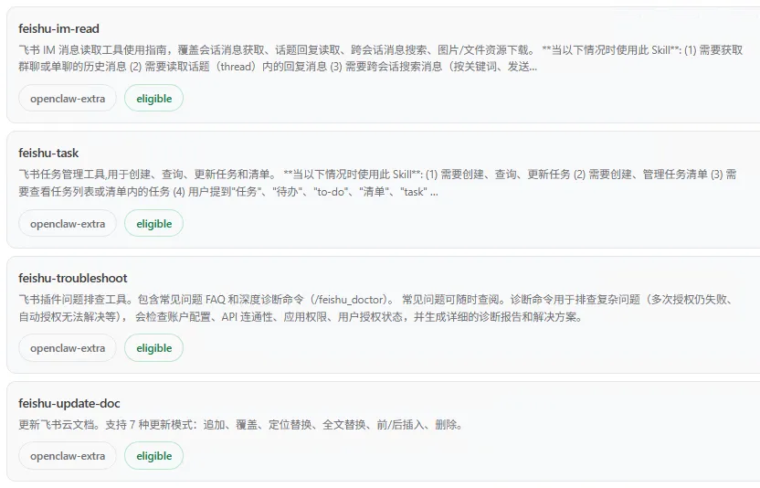 顺便说一下,这两个飞书插件在openclaw的网页面板里显示的内容不一样,不清楚功能有多少区别。