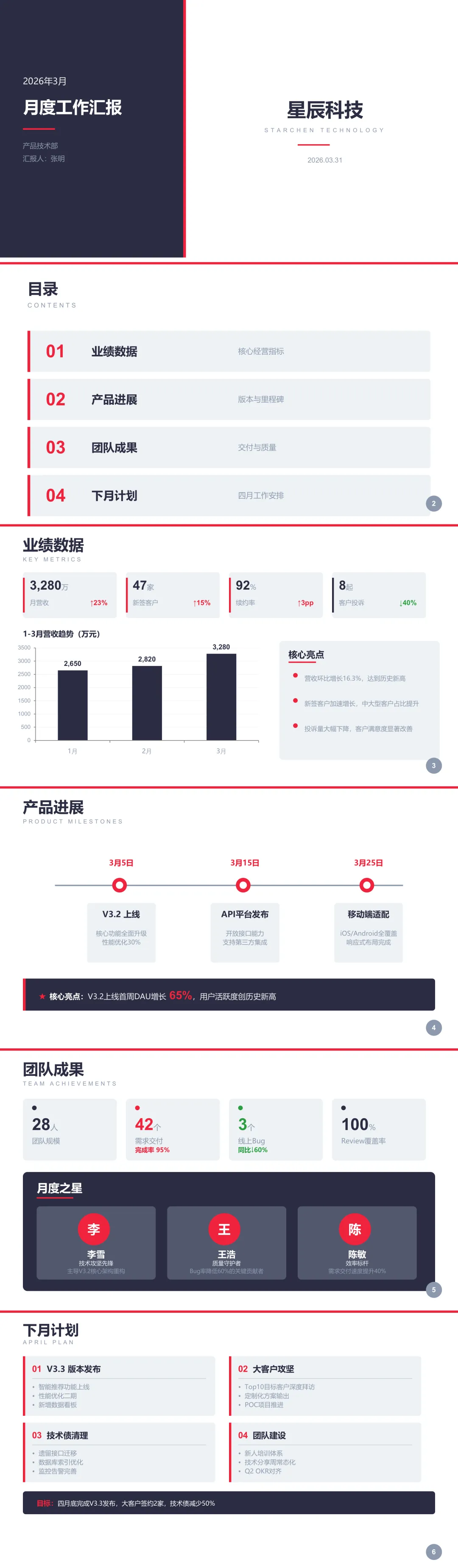 6页:封面、目录、业绩数据(营收3280万等4个kpi+柱状图)、产品进展(时间线3个里程碑)、团队成果(数据卡片+月度之星)、下月计划效果;