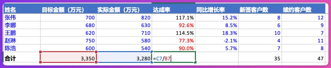 未达标的达成率标红,底部合计使用SUM公式