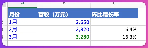 Sheet2“月度趋势”:1-3月营收(2650万、2820万、3280万),带环比增长率公式。