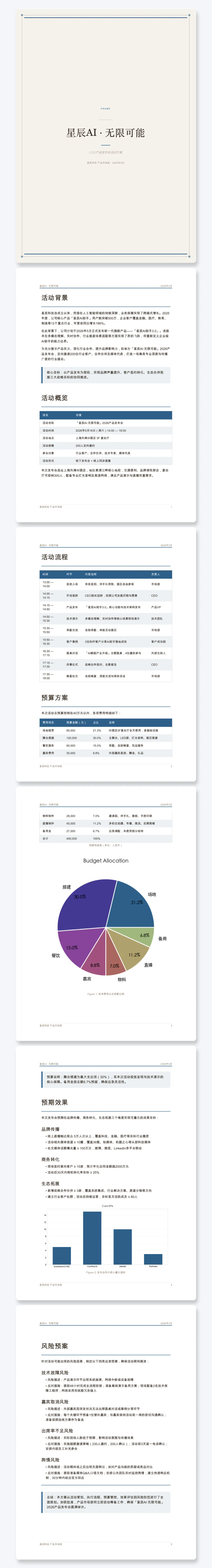 内容:活动背景、活动概览、活动流程时间表、预算方案40万明细、预期效果、风险预案