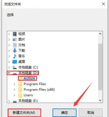 4.选择需要安装的磁盘,本例安装到D盘,点击【新建文件夹】并命名,点击确定。