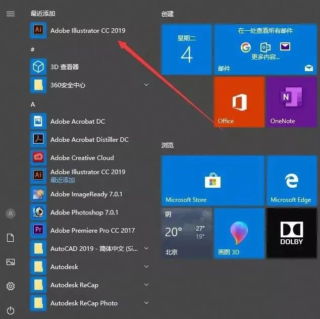 8.点击开始菜单,找到Adobe illustrator CC 2019软件打开。