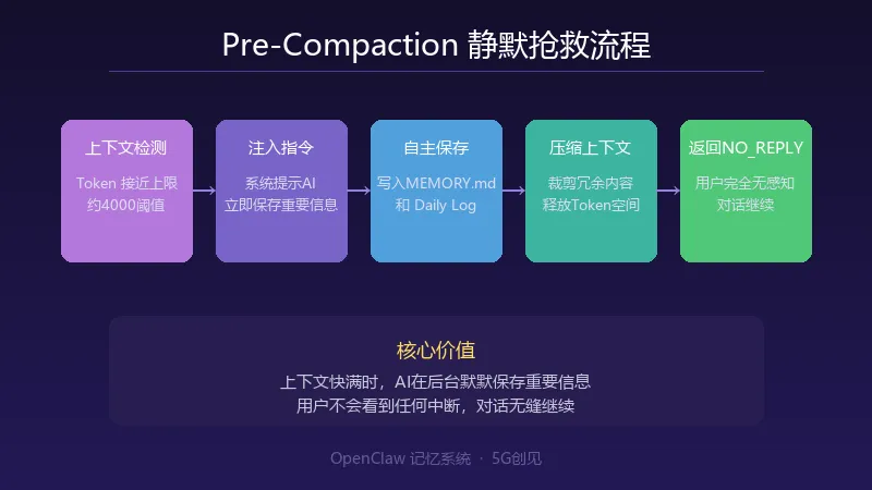 关键细节:用户完全无感知。Pre-Compaction 的返回值是 NO_REPLY,意味着这个轮次不会在对话界面中显示任何内容。AI 在后台默默地把重要信息存好了,然后继续和你对话。