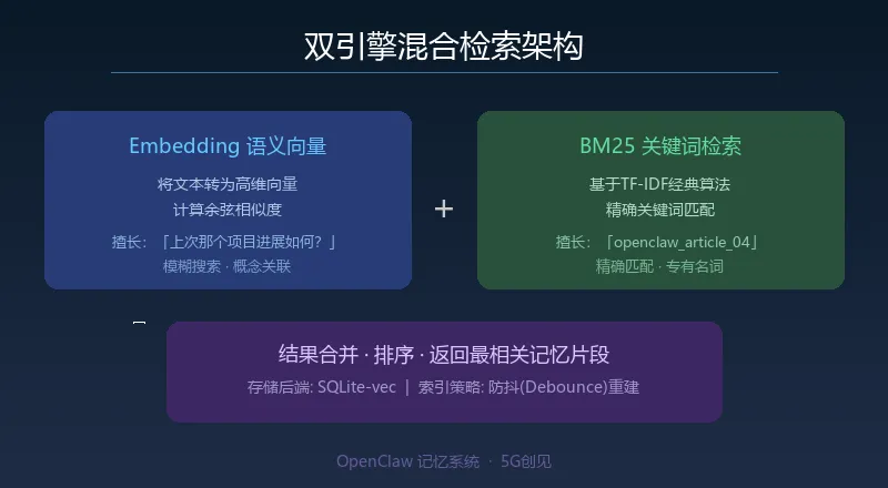 当记忆积累到一定量后,逐个读取所有文件变得不现实。OpenClaw 引入了混合检索引擎来解决「从海量记忆中精准找信息」的问题。