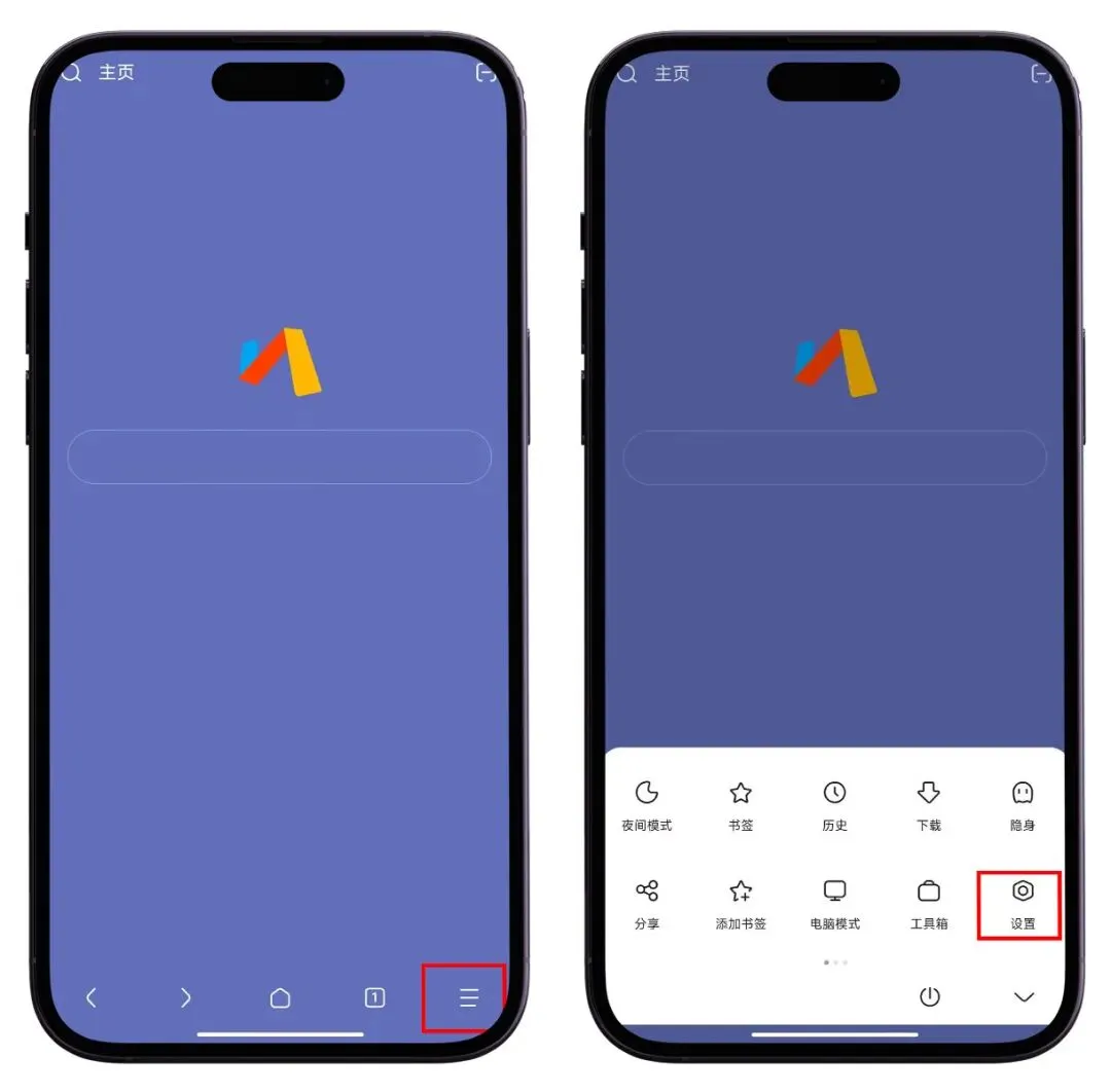 1.打开Via浏览器,点击下方的三条杠,然后找到设置;