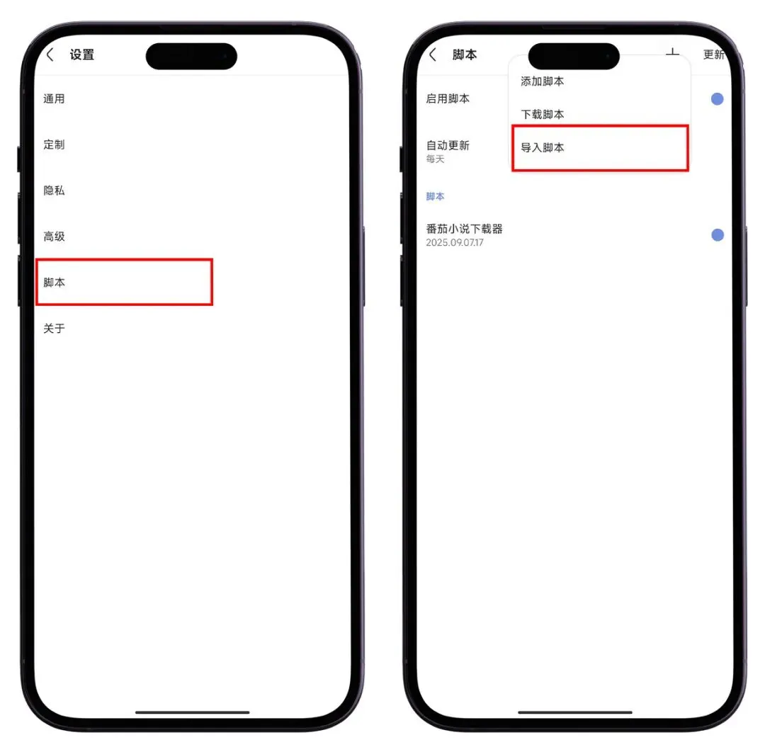 2.然后点击脚本,再点击右上角的+号,选择导入脚本;