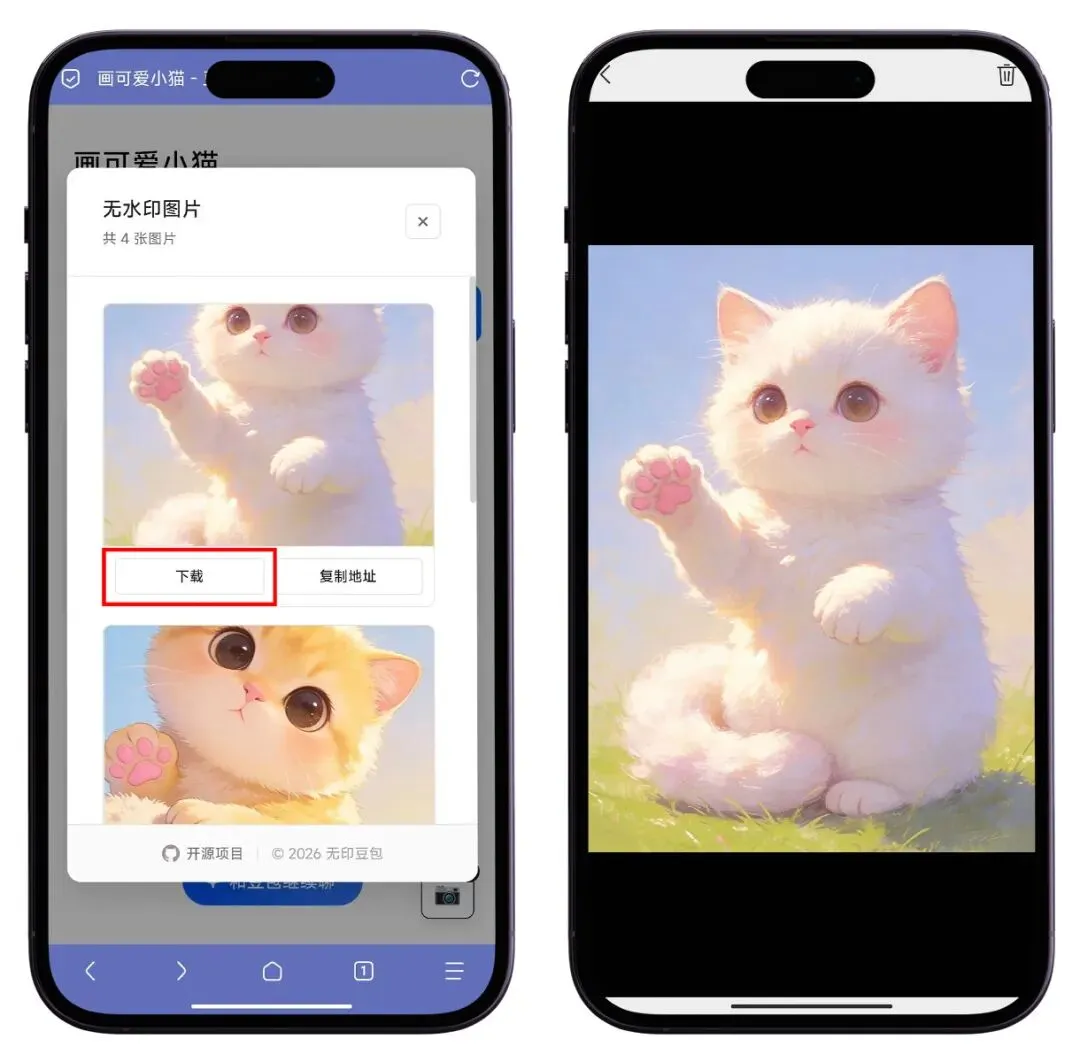 页面加载后,点击左下角的照相机图标,即可将无水印的素材保存到本地。