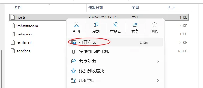16.打开路径C:\Windows\System32\drivers\etc,然后在hosts文件上右键选择打开方式。