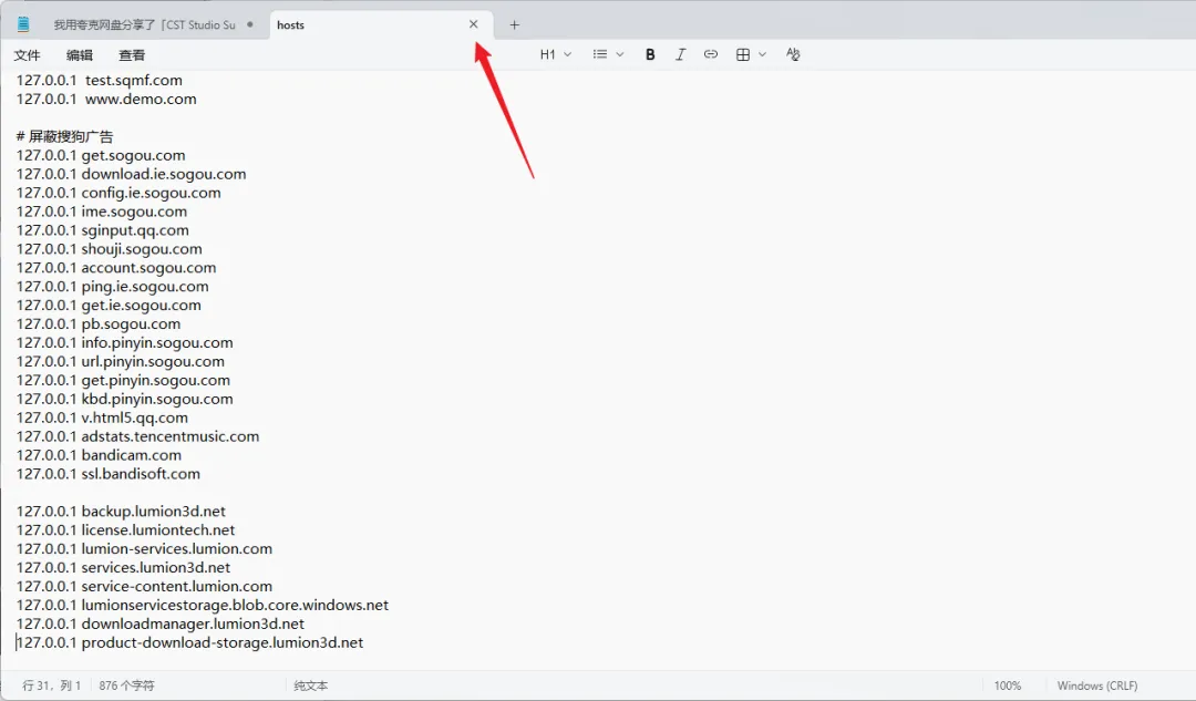 18.添加以下8行信息,然后保存后退出此窗口。温馨提示:部分电脑无法直接保存,解决办法是将【hosts】文件复制到电脑桌面修改之后再复制到原位置替换。