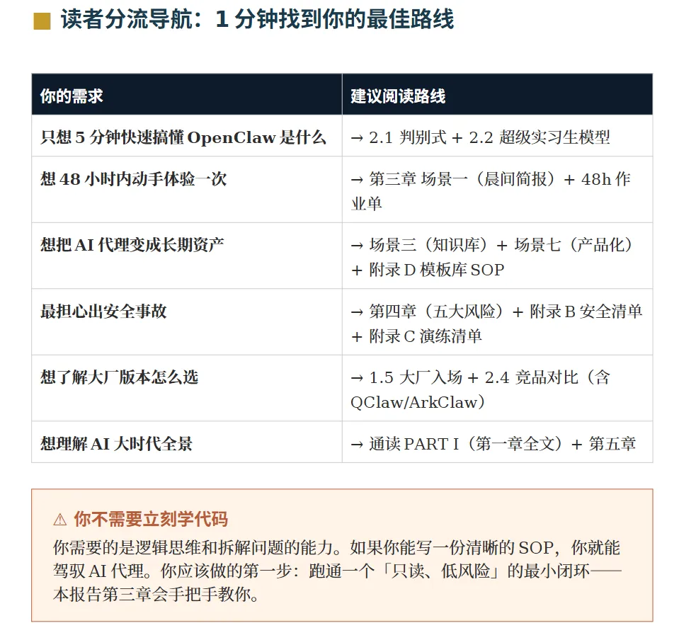 上手门槛远比想象更低,不用会代码,只要会写 SOP。报告给出 48 小时极简入门路线:第一天跑通 “只读” 低风险闭环,让 AI 抓取信息不做任何修改;第二天尝试半自动写入,逐步开放权限。七大实战场景覆盖晨间简报、邮件自动化、个人知识库、投研周报、内容选题、工作流串联、方法论产品化,每个场景都附带可直接复制的 Prompt 模板。