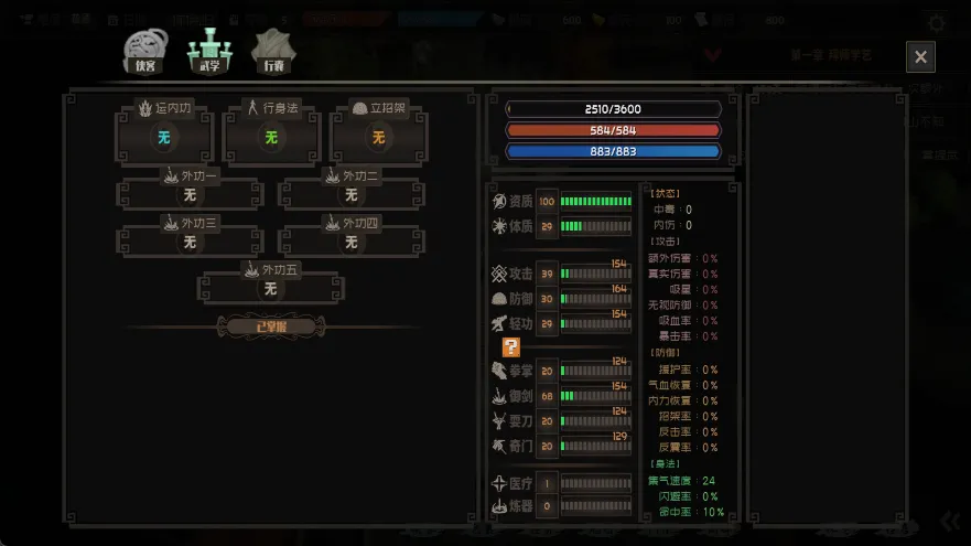 3、进入游戏后,按照引导依次打开【侠客】、【行囊】和【秘籍】界面,先学习基础心法,比如“轻声法”“气络决”或“血脉心法”。随后与掌门对话领取一本“铁布衫”。再前往门派的“闭关圆盘”,通过闭关积累感悟值,用于提升秘籍等级(最高可升至10级)。