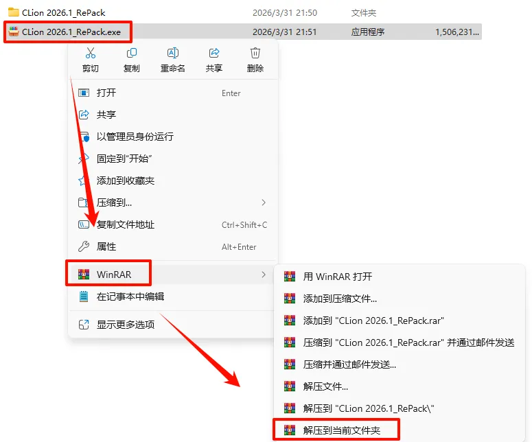 2.打开刚刚解压的文件夹,鼠标右键点击“CLion_2026.1_x64-(IDE`a).exe”选择“以管理员身份运行”