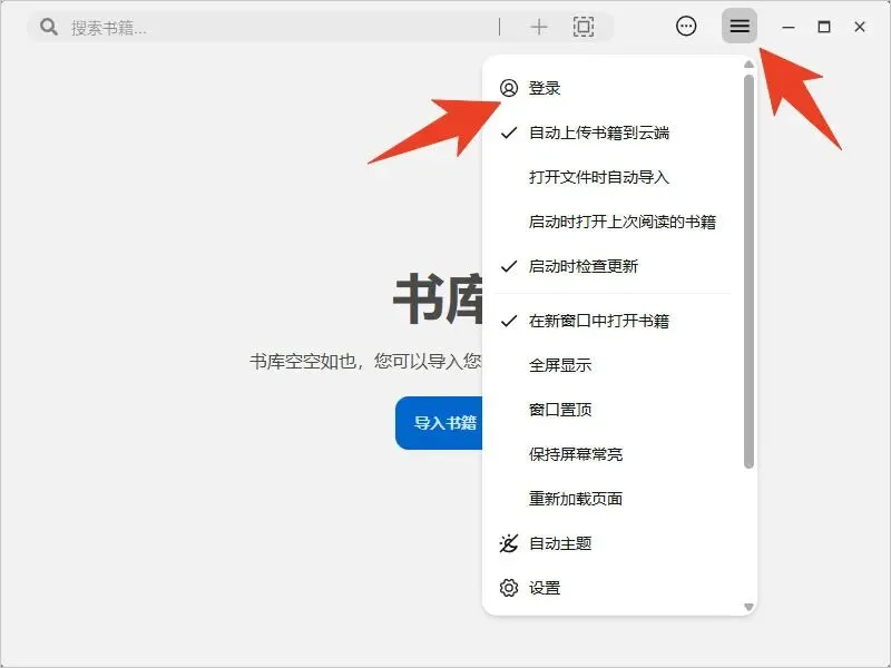 1、打开Readest软件后先点击其界面右上角的扩展功能图标,然后点击登录进行登录操作