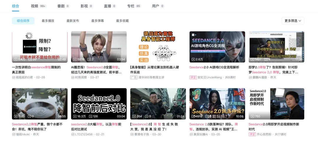 B 站「Seedance 2.0 降智」相关的视频播放量加起来得有几十万,有 UP 主专门做了降智前后的效果对比。还有人怀疑现在跑的根本不是完整的 2.0,效果和刚上线那会差了一大截。