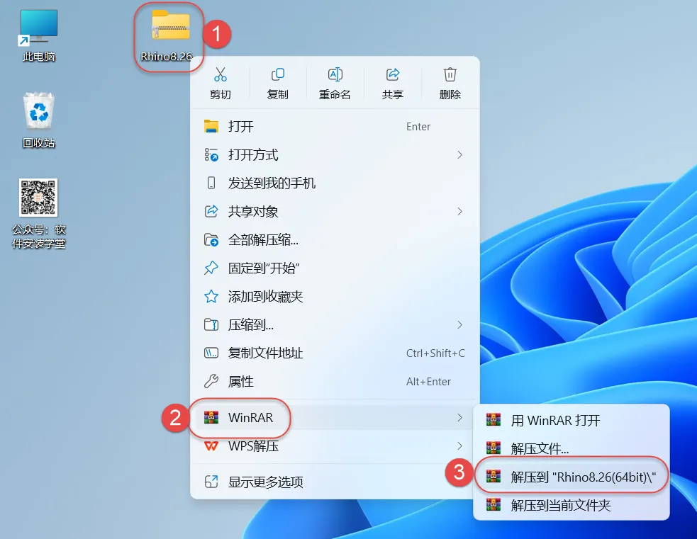 1.解压安装包:①鼠标右击"Rhino8.11(64bit)"压缩包②选择电脑上安装的解压软件③点击"解压到Rhino8.11(64bit)"。