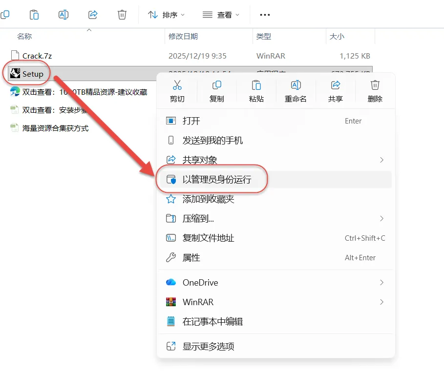 2.打开解压后的文件夹,鼠标右击"Setup"选择"以管理员身份运行"。