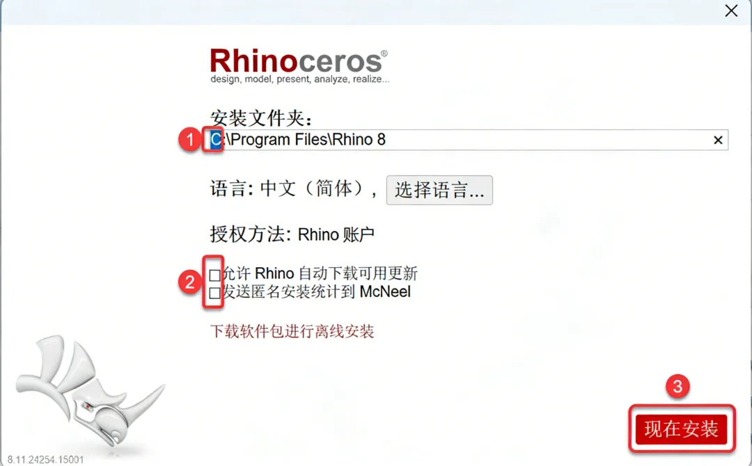 4.安装设置:①修改路径地址中的第一个字符C可更改安装位置(如:把C改为D软件将安装到D盘)②取消勾选"允许 Rhino……"和"发送匿名……"③点击"现在安装"。
