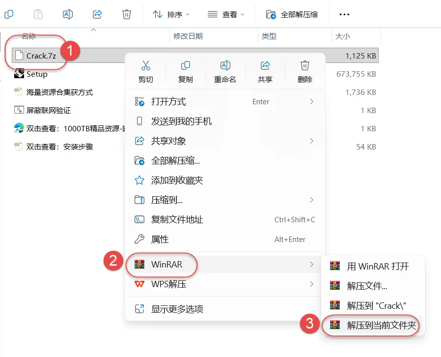 7.打开安装包解压后的“Rhino8.11(64bit)”文件夹,①鼠标右击“Crack”压缩包②选择电脑上安装的解压软件③点击“解压到当前文件夹”。