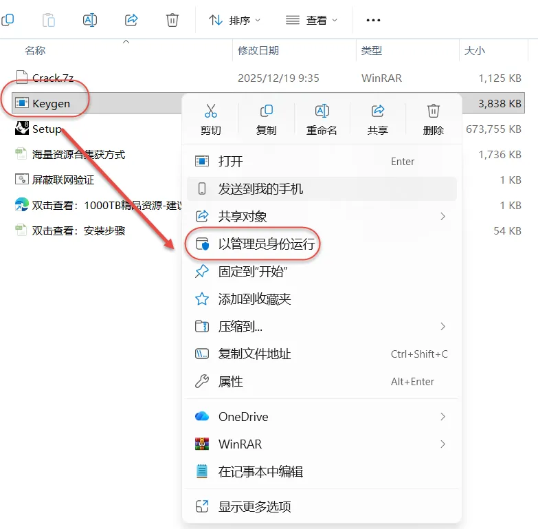 8.鼠标右击解压出来的“Keygen”选择“以管理员身份运行”。