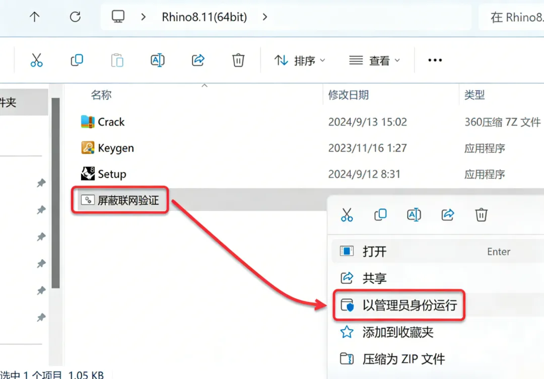 12.打开安装包解压后的“Rhino8.11”文件夹,鼠标右击“屏蔽联网检测验证”选择“以管理员身份运行”。(运行完成,会自动关闭)