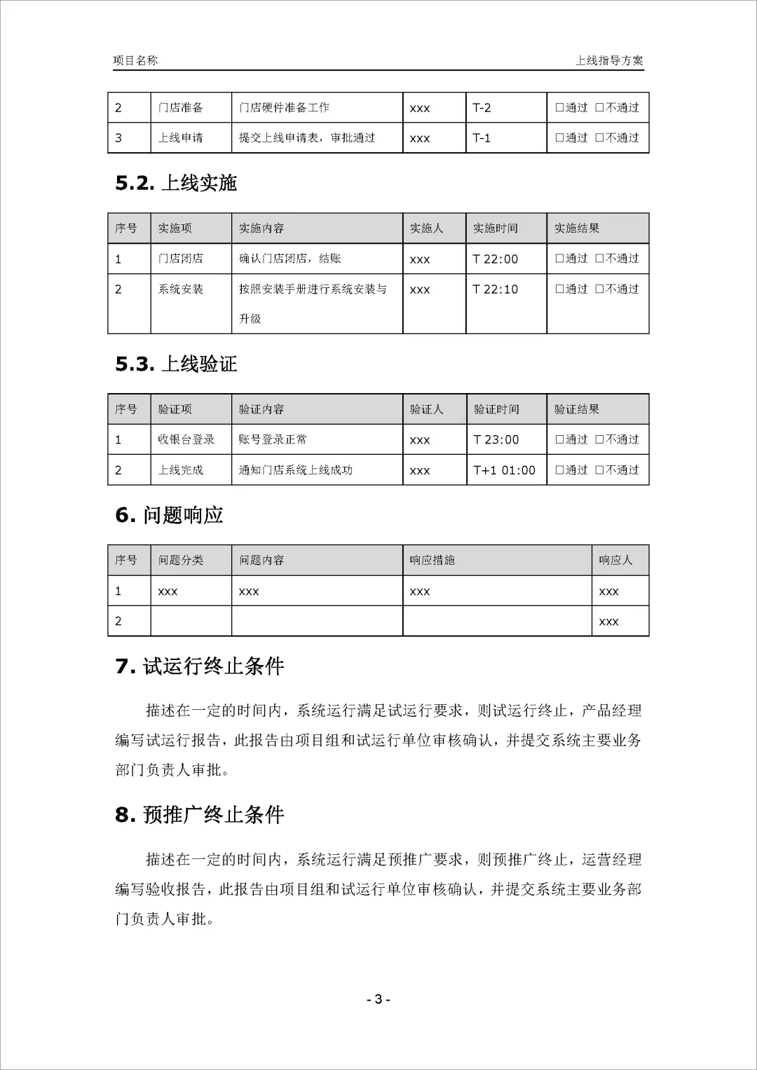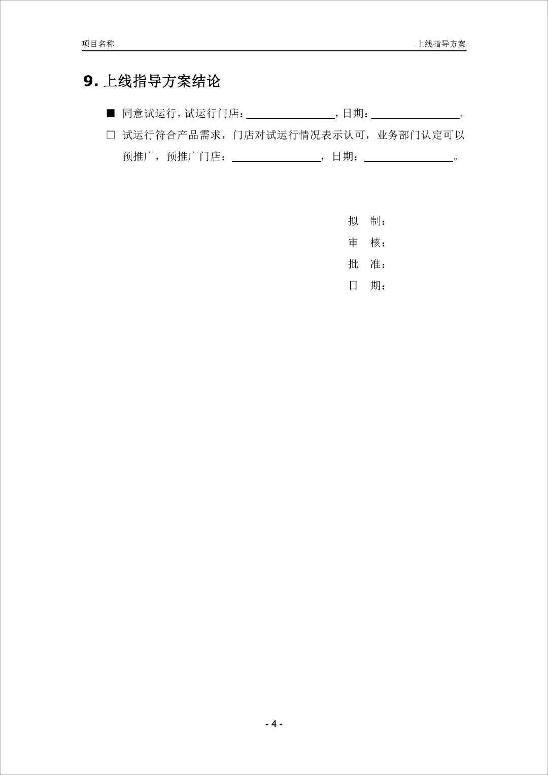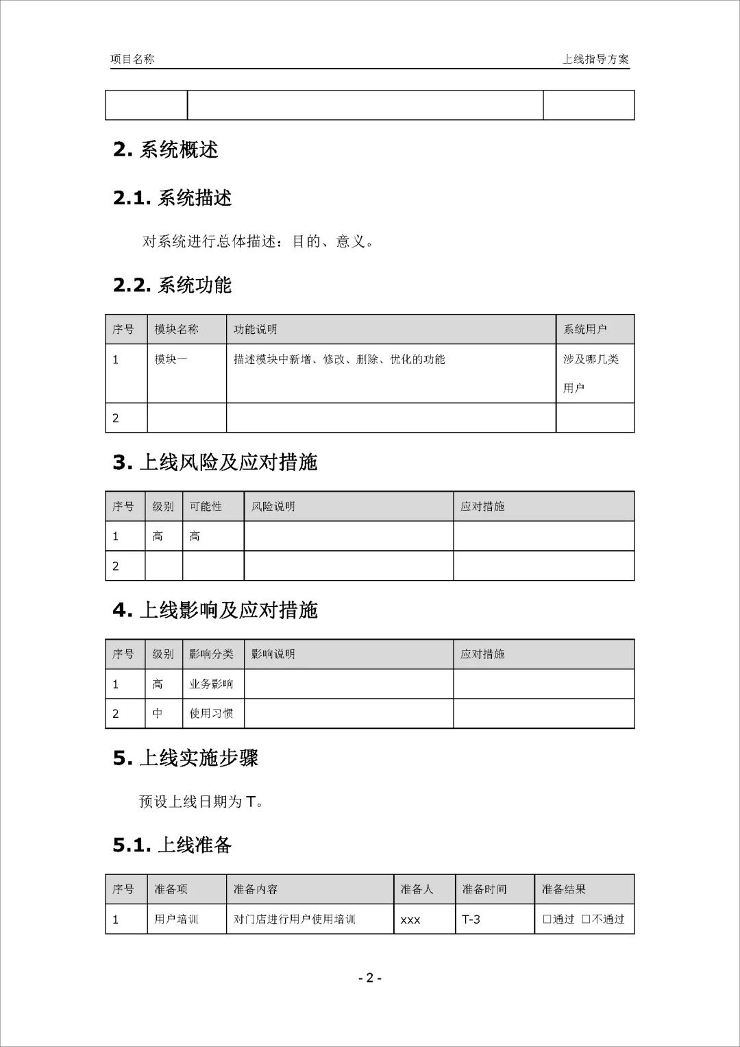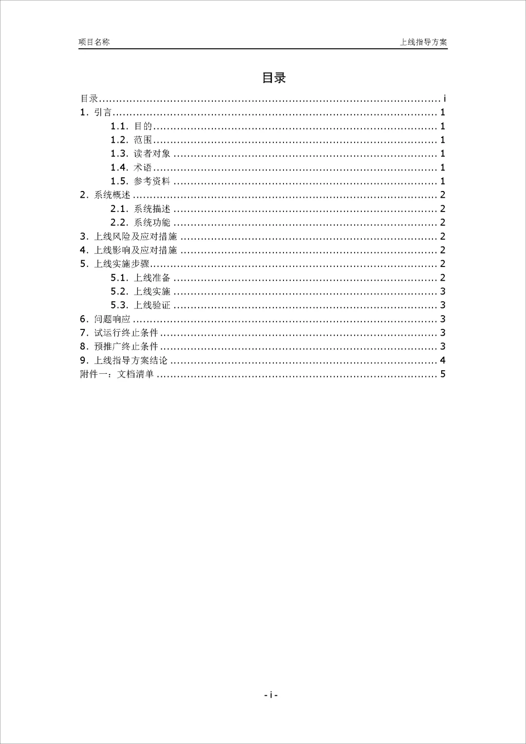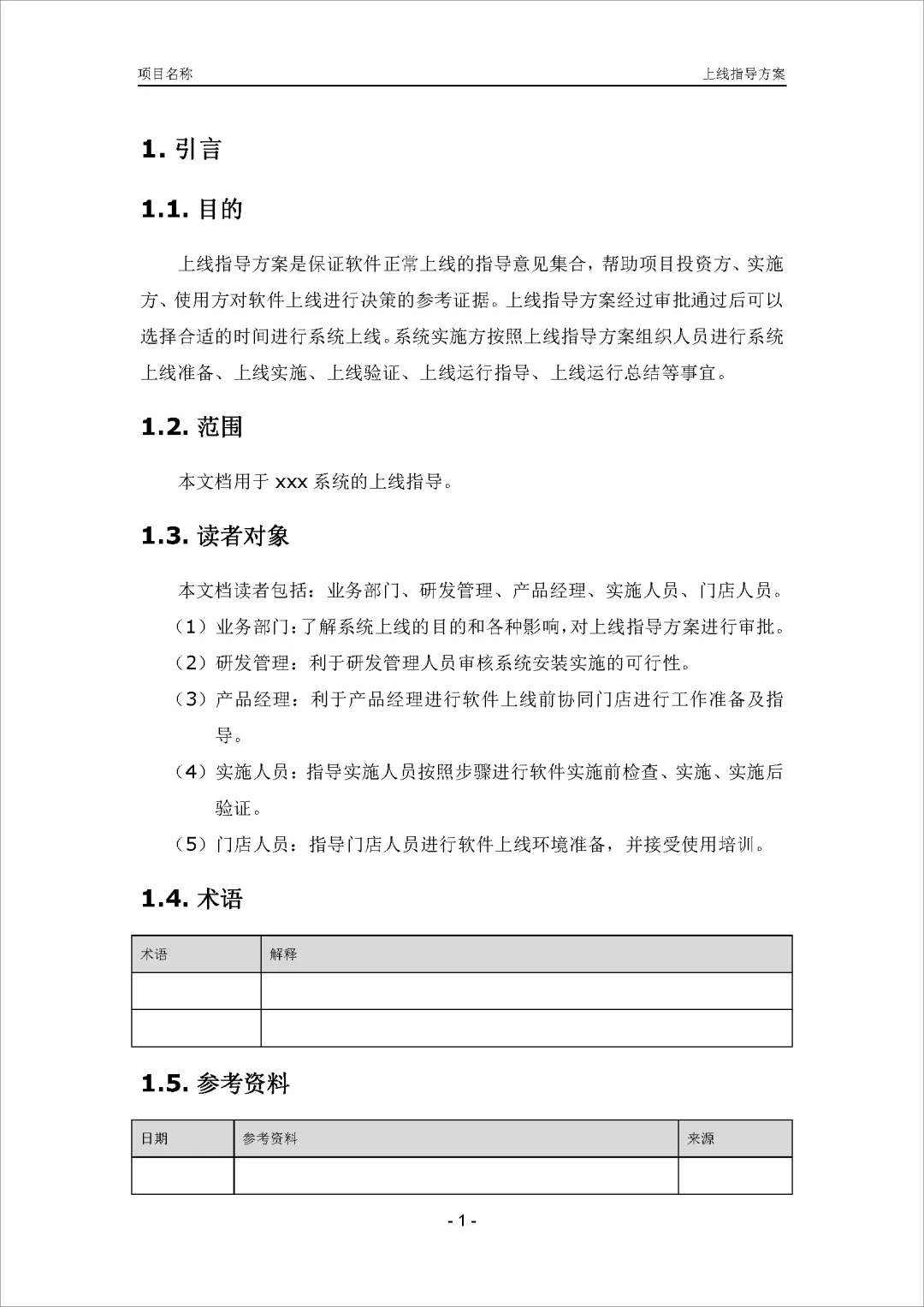 上线指导方案是保证软件正常上线的指导意见集合,帮助项目投资方、实施方、使用方对软件上线进行决策的参考证据。上线指导方案经过审批通过后可以选择合适的时间进行系统上线。系统实施方按照上线指导方案组织人员进行系统上线准备、上线实施、上线验证、上线运行指导、上线运行总结等事宜。