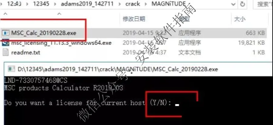 2.打开MSC_Calc_20190228.exe进入许可证制作界面,输入Y点击回车就可以自动在文件夹生成一个许可文件License.dat