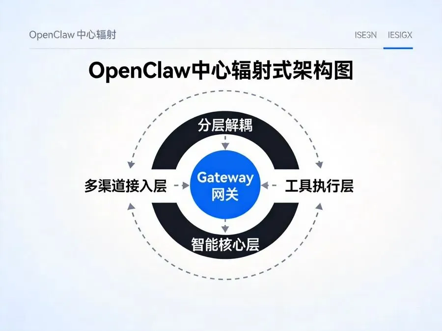 OpenClaw采用中心辐射式架构,以Gateway网关为核心中枢,所有子系统均通过标准化接口与网关通信。这种设计实现了交互渠道、AI推理、任务执行、能力扩展的完全解耦。