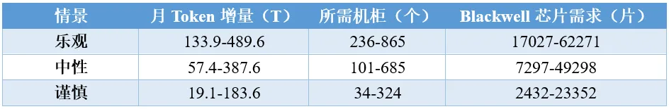以GB200NVL72芯片7000TPS/GPU为基准测算,算力芯片需求增量如下: