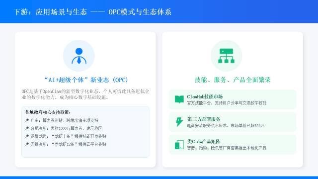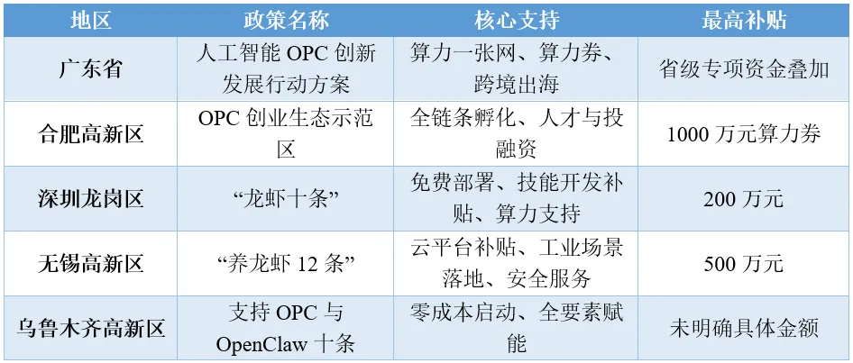 OPC(One Person Company)是“AI+超级个体”新型业态,OpenClaw为核心数字底座。广东、深圳、合肥、无锡、乌鲁木齐等地出台专项政策,给予算力券、资金补贴、金融支持,大幅降低创业门槛,推动超级个体具备企业级数字化运营能力。