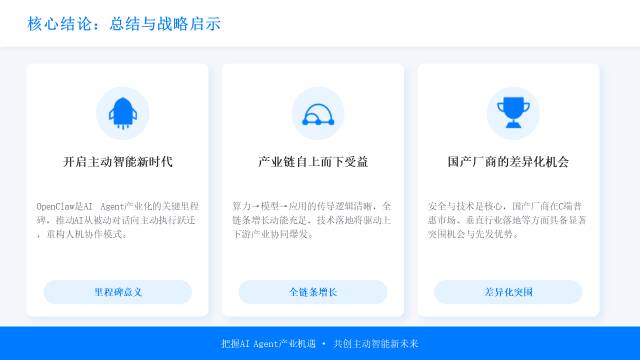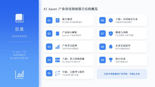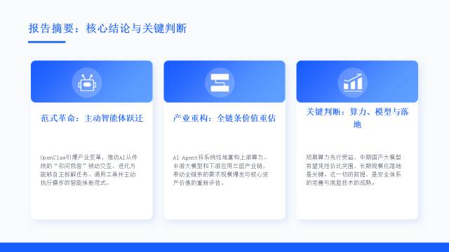 综合判断,AI Agent产业短期增长核心驱动力为算力需求抬升,中期看点为国产大模型性价比突围与生态完善,长期实现全场景落地需以安全合规、技术成熟为前提,OpenClaw引领的范式升级将持续释放产业增长动能,推动AI从工具化向自主化、系统化演进。