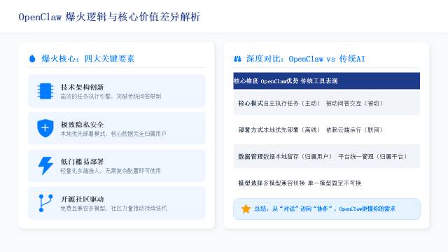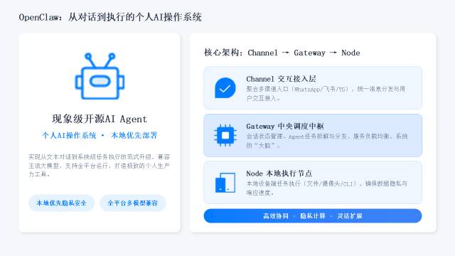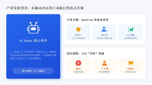 1、OpenClaw是AI Agent产业化的关键里程碑,正式开启主动智能新时代。OpenClaw以开源架构、本地部署、自主执行、持久记忆等核心优势,实现从GitHub破圈到全民“养虾热”,推动人工智能由被动对话应答向主动任务执行范式跃迁,是AI从工具走向主体、从交互走向行动的标志性产品,为全球AI Agent产业化提供成熟框架与生态范本。