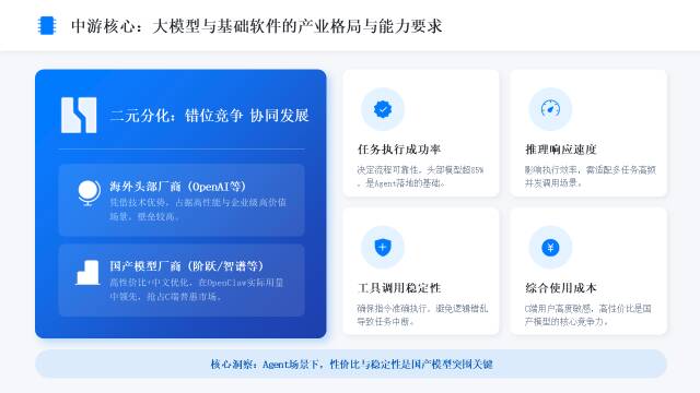 大模型与基础软件是AI Agent体系的核心大脑与运行底座,OpenClaw的普及推动大模型从通用对话能力转向任务执行、工具调用、自主决策的Agent专用能力赛道,带动产业格局、技术要求、竞争方向与支撑体系全面重构。