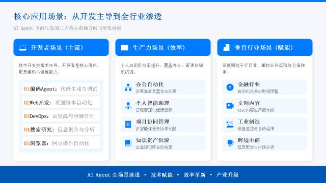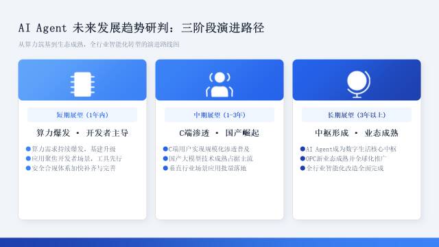 中期进入商业化落地、国产化主导、场景化爆发黄金期。全球渗透率提升至1%以上,C端用户规模化普及;国产模型凭借性价比与中文优化占据生态主流,开启全球化出海;办公、金融、工业、电商等垂直场景形成标准化解决方案,OPC业态初具规模。