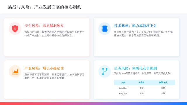 当前全球渗透率仅0.09%—0.24%,安全担忧、部署门槛、实用价值验证不足可能导致用户增长放缓;监管趋严、技术迭代节奏错配、安全事件冲击均可能抑制产业扩张速度。