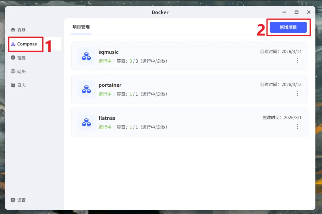 🔺然后点击极空间NAS的“Docker”应用,点击【Compose】 > 【新增项目】。