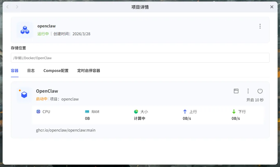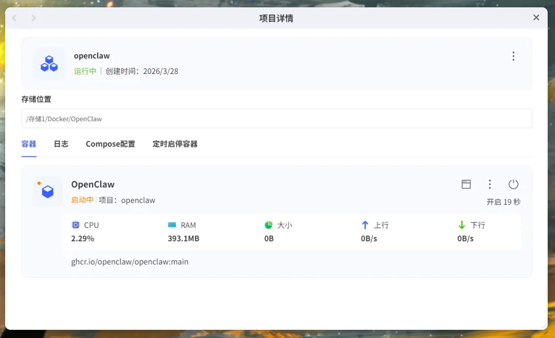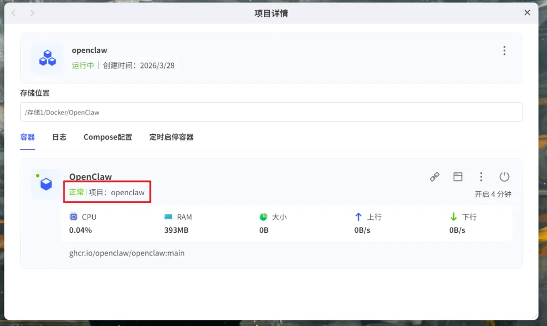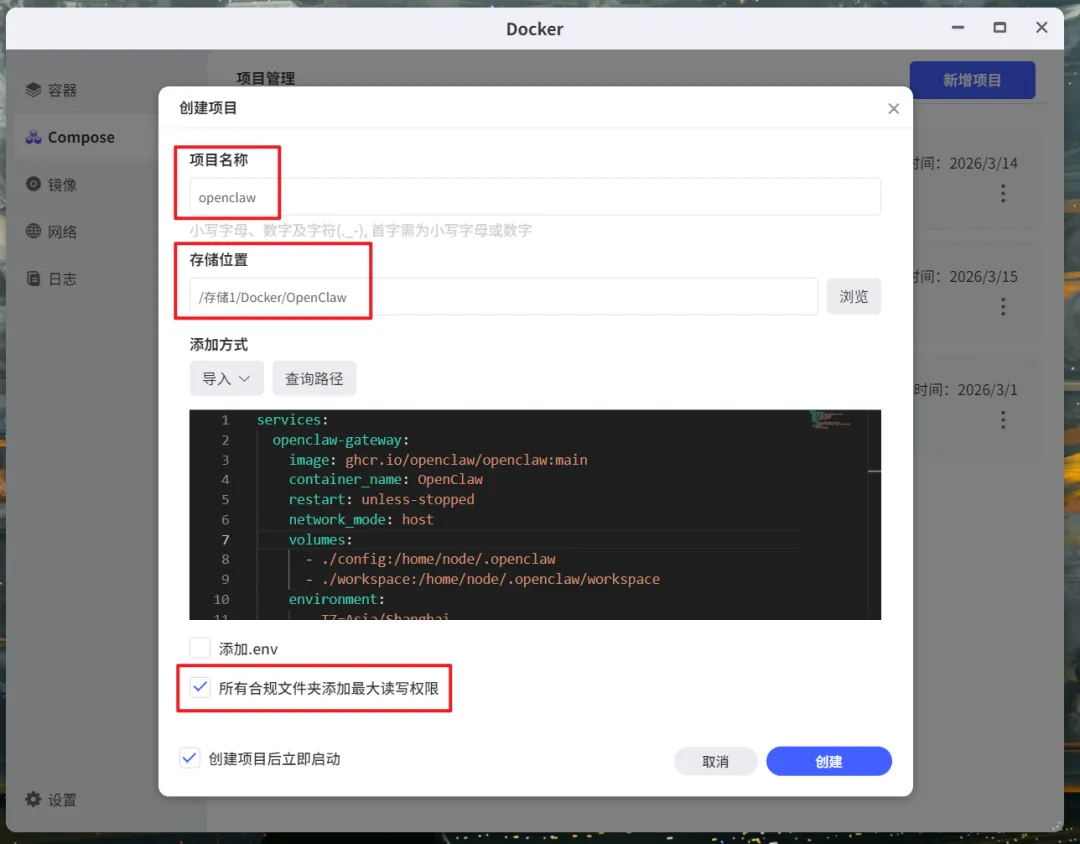🔺现在极空间的 Docker 已经支持相对路径,所以我们在部署 Docker 项目的时候,基本就不用在写那些又长又难记的绝对路径了。就比如说这个项目,我们只要自定义项目名称,“存储位置”需要手动选择我们前面新建的OpenClaw文件夹,然后勾选下方的“所有合规文件夹添加最大读写权限”,最后输入以下 Docker Compose 配置信息后点“创建”按钮: