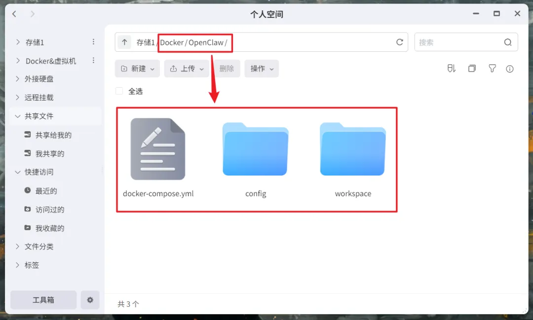 🔺这个时候如果我们刚回到刚刚新建的OpenClaw文件夹内,可以看到里面会有三个文件。docker-compose.yml是我们手动创建的,和Docker端输入的信息一致,用来定义容器如何运行;而另外两个文件夹是项目自动创建的,只要 docker-compose.yml 在哪里,这些配置和工作目录就会自动跟着生成在哪里,不需要我们新建目录,也不需要我们去找绝对路径,而这便是极空间Docker相对路径的优势。